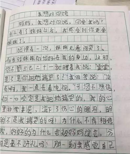 “妈妈,我想对你说,你爱我吗?自从有了妹妹以后,我感受到你更爱妹妹了。”