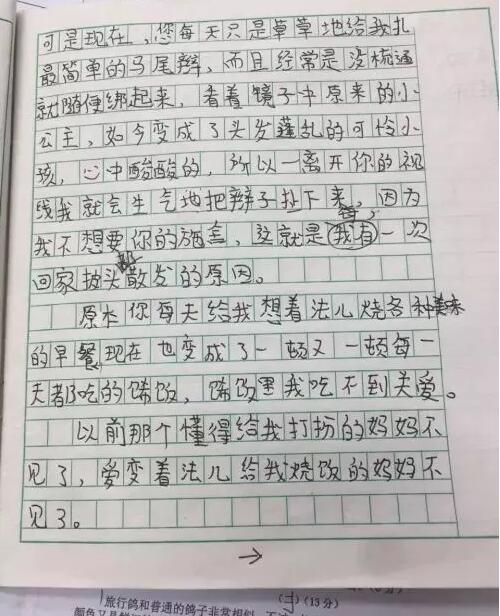 “以前那个懂得给我打扮的妈妈不见了,爱变着法儿给我烧饭的妈妈不见了。”